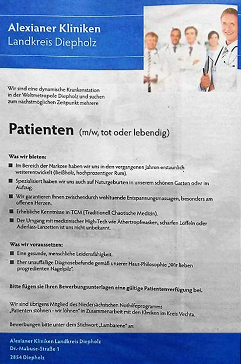 Seit einigen Tagen geistert eine vermeintliche "Stellenanzeige" der Klinik Diepholz durch alle Medien, mit denen die "dynamische Krankenstation" augenscheinlich um Patienten ("m/w, tot oder lebendig") wirbt.